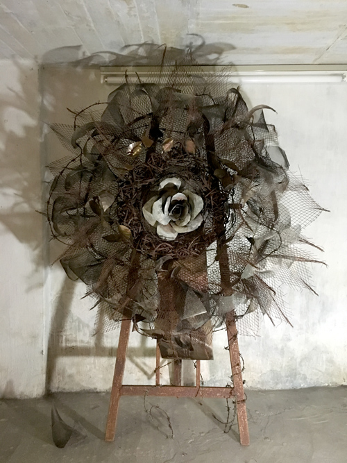 卒業生のパク・ステさんが崔先生と一緒に制作した、有刺鉄線と金網でできた不穏な花輪。