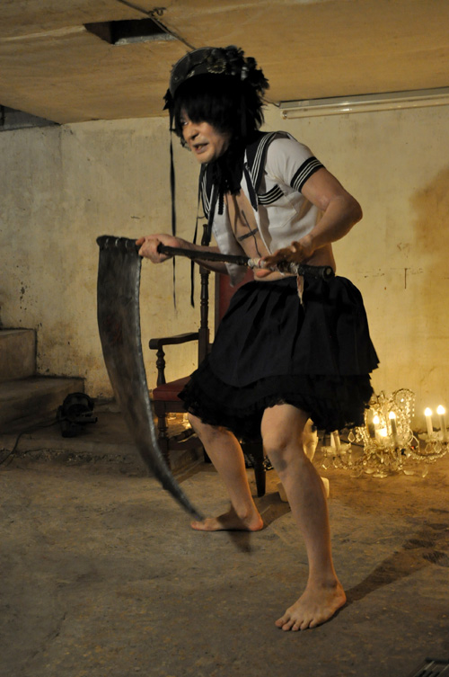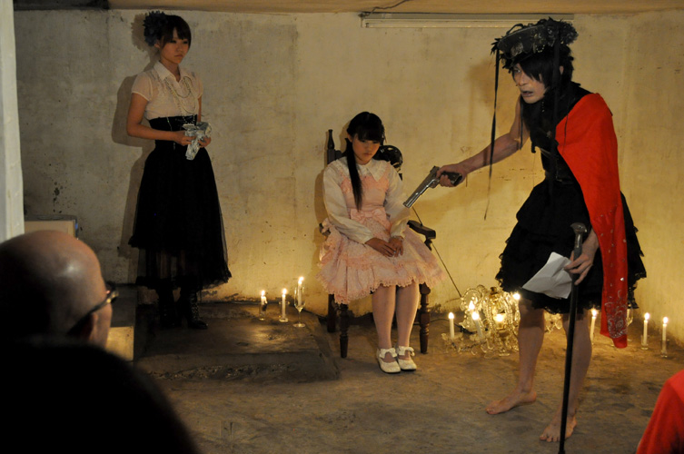 まずは東京ディスティニーランドの一人芝居。5月末に当地下室で行われた16時間一人芝居公演と同様に観客のリクエスト形式で始まった演目は『伝説のオウガバトル』。物語はおじいさんとおばあさんが桃を拾うところから始まる。月日は流れ桃から生まれた桃太郎は立派に成長し…。