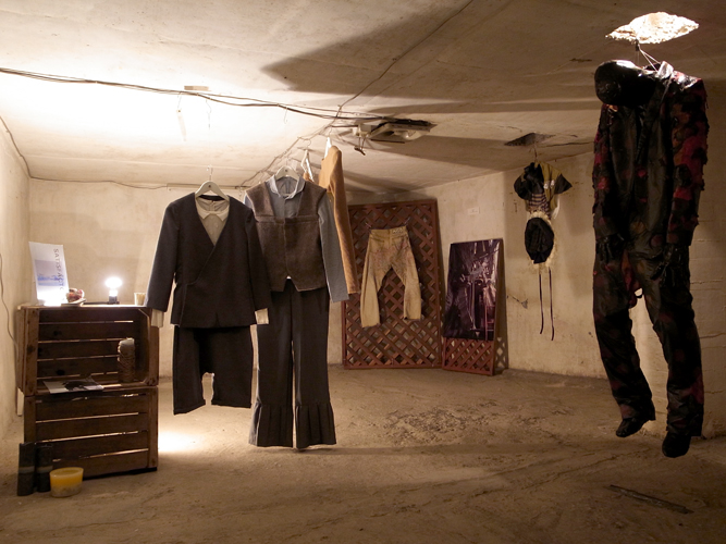 先週から始まった「地下フク」展、まず地下室へと通じる階段を降りると、1920年代あたりを彷彿とさせるシックな衣装をまとった男女2体のボディが出迎えてくれます。