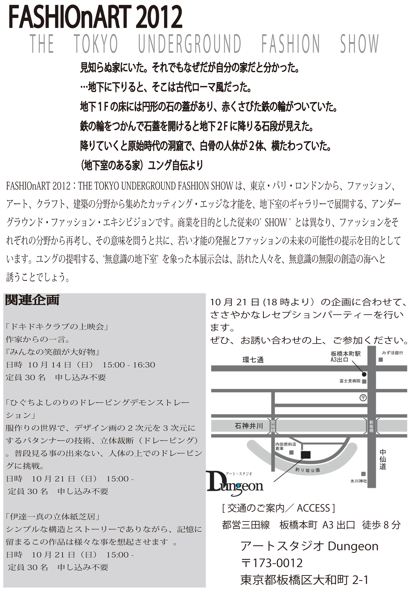 FASHIOnART 2012:THE TOKYO UNDERGROUND FASHION EXHIBITIONは、東京・パリ・ロンドンから、ファッション、 アート、クラフト、建築の分野から集めたカッティング・エッジな才能を、地下室のギャラリーで展開する、アンダー グラウンド・ファッション・エキシビジョンです。