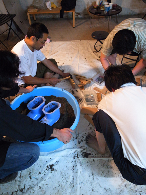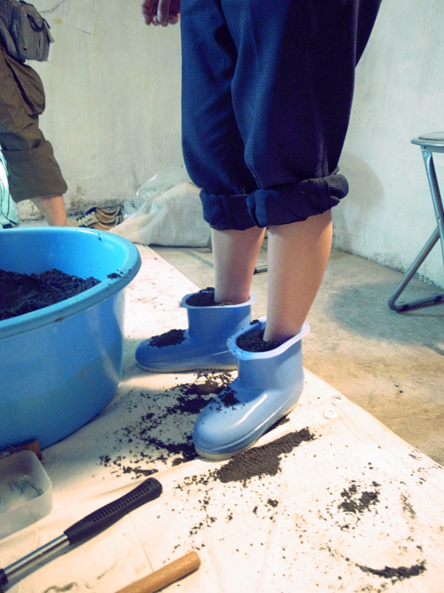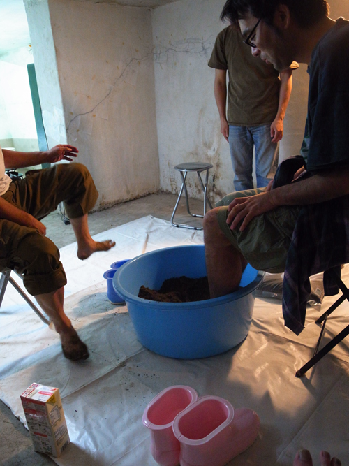裸足で地面を歩くときのあの快感を再現できないか、という今井さんの発想から、60キロもの砂や砂利が運び込まれ、地下室はさながら砂場の様相に。砂を入れた盥にみんなで足を突っ込んだり、砂利を混ぜ合わせたりと試行錯誤したあげく、ここに新たなワークショップが生まれました。