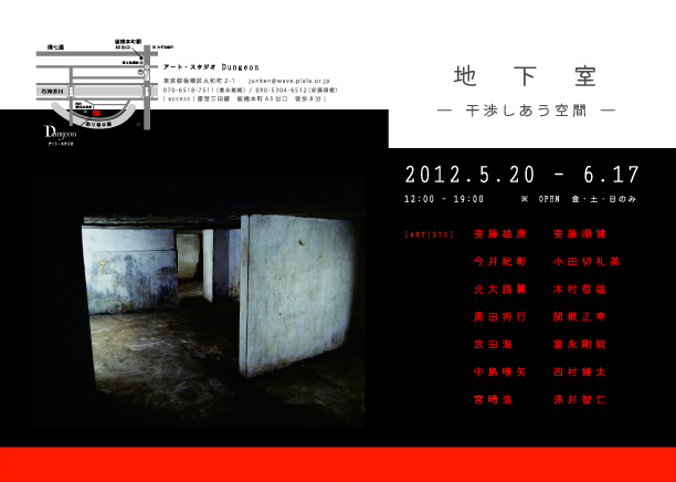 その音楽にまるでホワイトノイズを入れて介入するかのように『SCANNER』と題された安藤順建の映像作品が同室にある。彼は安藤雄康の弟だ。映像は日々の彼のフィールドを撮影したものを再度スキャニングしているかのように編集され、ループで投影されている。壁のコーナーに対して仰角ぎみに投影されているので、映像画面は五角形になっている。その五角形は落ち着いていて穏やかな家の形を想起させる。地下室という非日常の空間にいて、この家の形は、不思議な安心感をつかの間与えてくれるのだが、映像の内容は、かなりきわどいものもあり、そのギャップが我々の奇妙な現実社会を考え直す契機として機能している。彼自身の言葉で「自分の頭の中をスキャンしたとでもいえばいいのか?」というフレーズすらもかき消すようにスキャニングする時の、あの行きつ、戻りつ、するモーター音が『Coffre-fort』という兄の音楽オブジェ作品と合奏を楽しんでいるようにも感じられる。