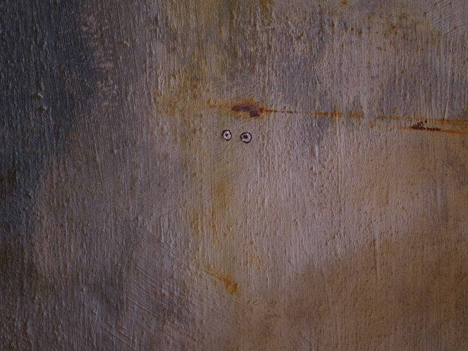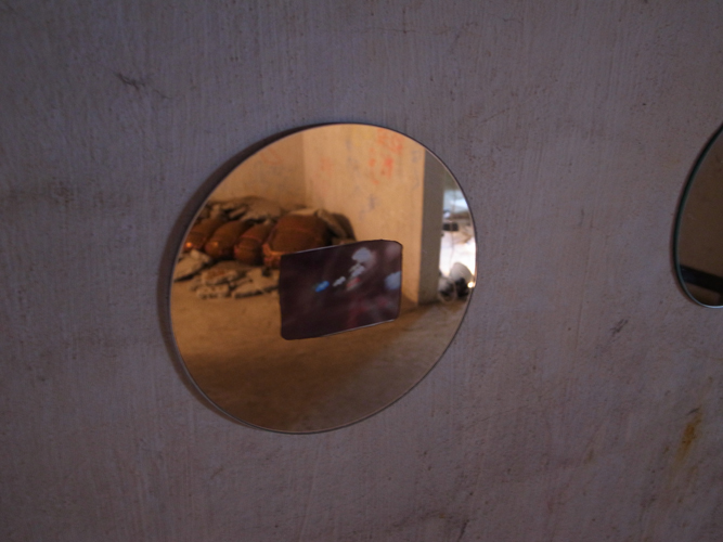 そして、振り返ると、富永剛総の『丸鏡』が二枚、壁面に取り付けられている。東京の夜景をピンホールカメラで写し撮ったもので、原理上、ピントはすべてにあっているのだが、ぼやけて見える。フレームとして使っている鏡が今井の『十円大仏の足』を写しこんでいる。鏡の裏側の鏡面塗料を削り取り、写真をはめ込み展示していく手法を富永は時々見せるが、その影響はヤン・フートが、かつてワタリウムで見せた“視覚の裏側”展にあると思われる。彼自身にフランドル派が持っているアイロニーが備わっているとは思えないが、視覚芸術の一端にいると自覚している彼はときたまこのような展示方法をとる。鏡自体は五年前にアムステルダムの展示に使用したものなので、表面は傷つき、薄く曇っている。そこに時間の経過を見ることもできるのだろうが、経過する時間の無化をこそ感じてもいいのだろう。富永自身は展示期間中に、地下室でフィルム現像を試みるそうだが、それらのフィルムは当分プリントされることもなく、地下室の天井からぶらさげられるのだろう。