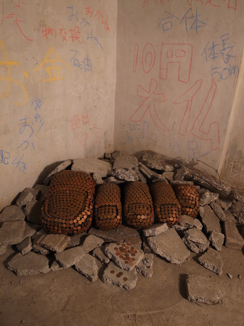 まず、眼が地下室の展示のためにしつらえた照明に慣れる前に、今井紀彰の『十円大仏の足』が立ち上がってくる。三年前に製作されたこの作品は横浜の旧財務省で発表され、台東区浅草橋、そして板橋の大和町へとやってきた。作者の今井自身の説明によると、この『十円大仏の足』は初期の仏教にあった仏足石と現代最強の偶像である“お金”が合体したものである。