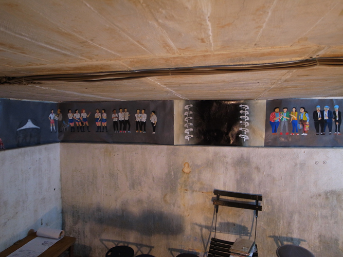 木村の作品から、眼を少しだけ下へずらすと、黒田将行の『カベの人たち』がある。白いガムテープの表面に黒マジックで目玉を描き、輪郭に沿って切り抜く。その切り抜かれた目玉を貼ることによって壁のしみが顔に見えるような箇所を彼が選んでいる。のっぺらぼうに目を入れることによって顔と見立て、こちらを見ているように壁の存在を浮き上がらせる。壁に人格を持たせようとしているのかもしれない。混沌に目鼻を入れて、混沌を殺してしまった古い逸話を思い出すのも面倒になるくらい、黒田のこの作品は茶目っ気に溢れた悪意があるように思われる。人の眼にあまり触れられずに蓄積した時間を表面に持つ、この地下室の壁は黒田によって、眼を入れられ、ある種の人格をもつようになる。壁が語ることはありえないが、人は、壁を見つめながら、自己問答を繰り返す生き物だ。壁も語り始めるし、眼も物語る。まして作者を超えて観客が語り始めるのも時間の問題だろう。