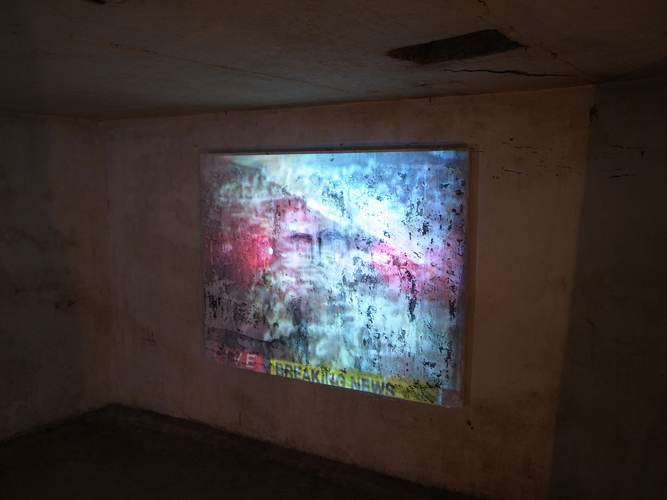 宮嵜浩の『DON’T THINK』はキャンバスに描かれたセルフポートレートともいえる絵に対して、緊迫した社会情勢を伝える映像を編集し投影している。バクダット空爆、北朝鮮の軍事パレード、大津波、核実験のキノコ雲、眼を見開くアジアの女性、ライブに熱狂する観客、報復のための絞首刑。それらが、ひび割れ、焼け爛れたかのようなキャンバスの表面に映し出されている。表面が剥がれ落ちた質感は絵画の荒廃を表しているわけでもなさそうだが、投影される映像と剥がれ落ちたキャンバスから浮かび上がる彼自身の嘆いたような表情が重なり合うとき、また別の意味を見るものに生みだしているような気がしてならない。すくなくとも私は意味を超えた、なんらかのメッセージを彼と彼を取り巻く世界から受け取ることが出来たような錯覚に陥った。