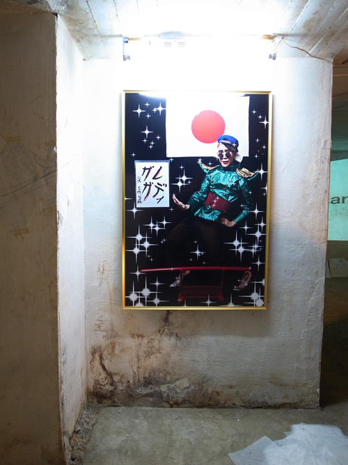 その部屋を出て、奥の部屋へ行くと武田海の『ミスユニバース斬り』が微妙なバランスを保って立っている。内臓を露にした女性は冠をかぶり、凛として笑みをたたえている。彼女の冠は地下室の天井の穴から射す美しいぎりぎりの光によって輝いている。そして床には縮尺がことなる人体像がもうひとつあり、それは肥満体の男が少女の膣に頭部をめり込ませながら呆然と立っている。『ヨカッター』という作品だ。双方とも、像の素材は布と和紙、そしてFRPで出来ており、非常に軽い。その軽さは台座の傾き具合からも察知できるが、その軽さがもたらすものは、かつてマルセル・デュシャンが石膏によって大理石と見まがうものを作ろうとしたのと同じ作用を感じさせる。重そうに見えるので、そのつもりで身構えて手に取るとあまりに軽すぎて、驚く。そう、イサム・ノグチがバルサ材を用いて大重量を感じさせるかたちを探求してした頃の、ある種の精神。そういうものを感じる。その精神性が何なのか私には分からないが、まだまだ何かを学びたいという強い欲求を、武田の作品を眺めていると、感じる。期せずして、この奥の部屋の作家たちは学生の身分をもつ人が多い。Cim↑Pomの兎城竜太が美学校で受け持つ講座の天才ハイスクールの受講生たちが数名作品を出している。宮嵜、涌井、西村がそうだ。