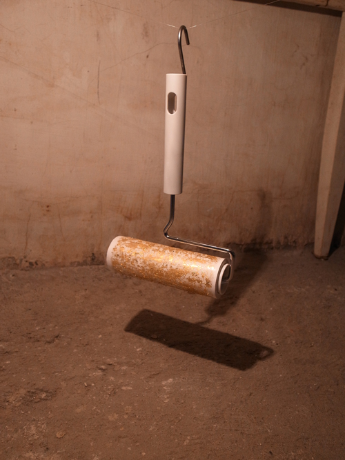 そして机の下にコロコロを吊り下げたのが西村健太。床の埃を粘着テープで取るこのコロコロというあだ名を持つ清掃道具自体も愛嬌がある存在だが、西村の今回の作品もユーモラスだ。作品タイトルとして『Keep Clean』と名づけられている。机の脚と天板が接合する部分二方からテグスで吊り下げられ、天板の裏側あたりに取り付けられた小型ランプがコロコロをまるで舞台俳優のように照らしだしている。そのコロコロの粘着面には金粉が綺麗に張り付いている。どのような豪邸の掃除をしたのだろうか?それとも日本画の技法で金箔を背景に貼りコロコロで部分的に剥がし取るというような侘び・さび・きらびやかの技法でもあるのだろうか?