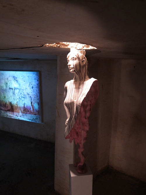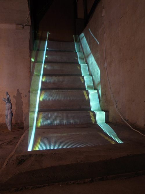 エスカレーターを撮影したものを地下室のもうひとつの階段に投影しているのが小田切礼美。タイトルをまだ考えあぐねているらしいが、身体性を失っている状態を意味するタイトルにしたいと言っていた。エスカレーターの映像は階段に投影されると、無数の剃刀が上下するようにも見え、残酷な拷問がその先に待ち構えているようにも感じられる。試しに数段この階段を上ってみると、自身の影により残酷な剃刀の刃は消え去り、作者の意図するところとは別の意味で、あらたな身体性を見出すことが出来た。小田切のプロジェクターから漏れる青い光は武田の立体像の美しい背景照明になっている。