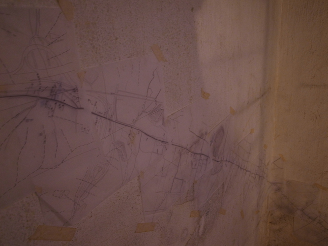 木村、黒田の作品がある壁の対角に関根正幸の『中仙道地図』がある。ローテーブルの上に大量のトレーシングペーパーが積まれている。中仙道の地図のトレース上に実線を関根自身が書き加えたもので、地図批判をするために必要な作業であったらしい。それらはデータとしてまとめられ、もはや必要なものではなくなったそうだが、地下室の壁面につなげて貼りなおすことによって、壁に何時出来たともしれない現実の亀裂と、地図という創造された現実からトレースされた中山道という一本の道筋が奇妙に呼応する。中仙道レーベルという現代音楽のレーベルを90年代に立ち上げていた関根は今となっては「特に中仙道に深い思い入れがあるわけではないのだが、、、。」と漏らすが、日本橋から京都へと続く、東海道とは別の、もうひとつの道、中仙道というものをふたたび考えてみる時に、‘目的地へ到着する道はなにもひとつだけではない。ということに気づかされる。そして彼の、この中仙道ラインは天井を這い、隣の部屋へ介入してゆく。