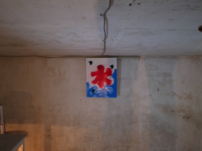 まだ、未完成であるらしいが、一枚のつるつるした絵が蛍光灯の管を抜いた場所に架けられている。カキ氷屋のマークに千鳥模様がダブルイメージで描かれている。画面下部には水色で波の文様。そして緑色で浜千鳥が三羽下降するかのように配置されている。浜千鳥の文様のせいか名古屋方面へいきなり意識を持っていかれる。無意識の領域をあえて操作しようとしているところが涌井の魅力なのだろう。彼自身は音楽を作る人物であるが、この時期、フィールドレコーディングばかりを続けていて、作曲にいたっていないらしく、音楽作品の提出が今回遅れているが、それを待つ間、彼のグラフィックワークを眺めているのも悪くない。何故か壁の隅に養生シートが置かれている。それが逆に彼が描ききっていない世界を思わせるには充分な角度で壁にもたれかかっているのだ。