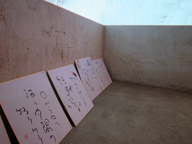 展示初日に行われたパフォーマンスの産物で、彼は肉体的に責められながら俳句を詠んだのだ。SMプレイが記された二つ折りの紙片を、女王様に指名された観客が選び、そのSMプレイの行為を受けながら俳句をひねり出す。それらの句は色紙に筆書きされ、彼の肉声で読み上げるのだが、観客からブーイングがあれば何度でも句を、あらたにつくる。という過酷なもの。