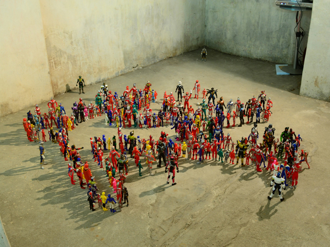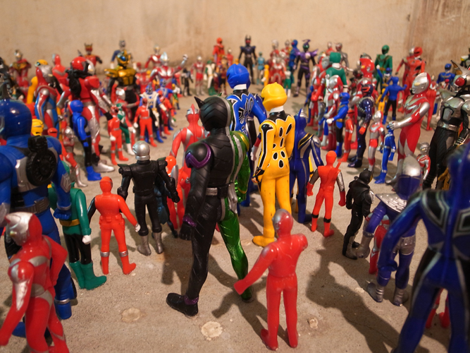 今井さんの身体を正確に象った人型を、ソフビ製のヒーローたちが囲繞するように並んでいます。