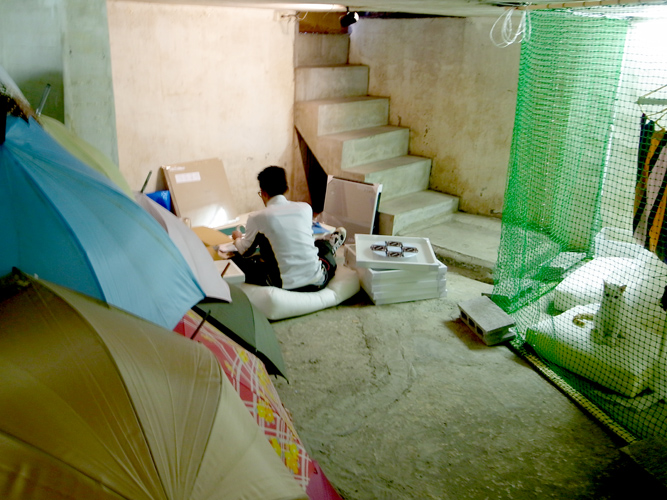 傘のシェルターはこれまでに屋内野外を問わずいくつも作っており、今回の地下室版は今までで最も小さいそうで、このサイズはホームレスの住居として段ボールより相応しいのではないか、とのこと。