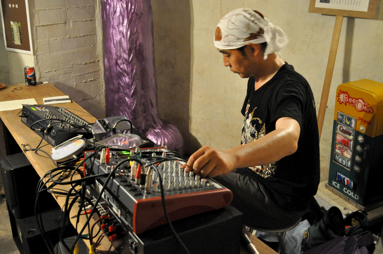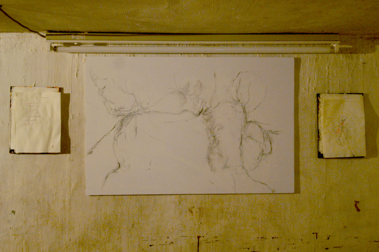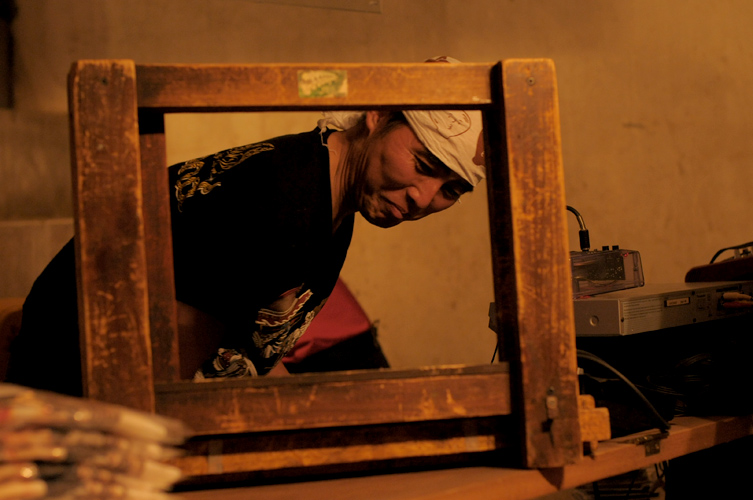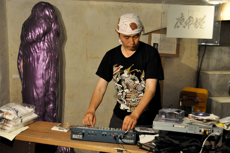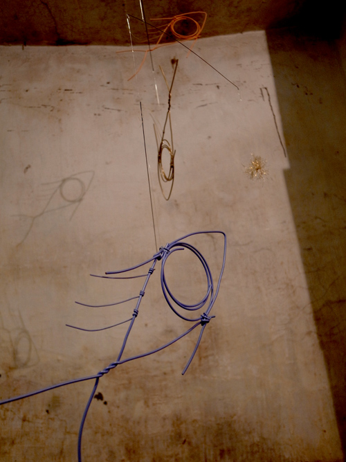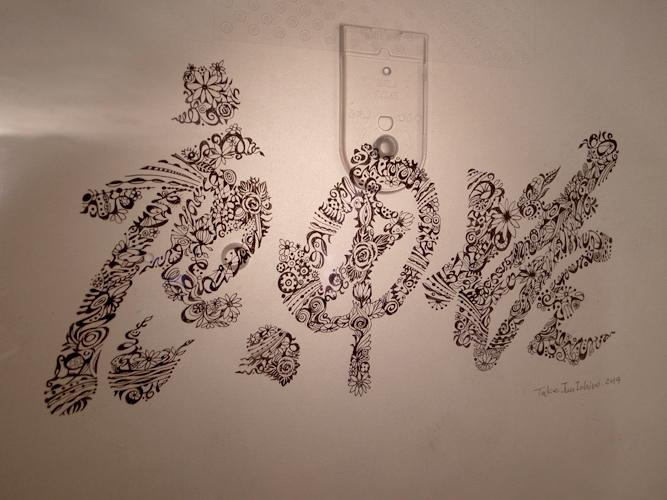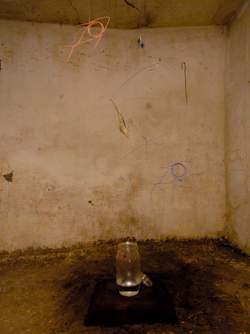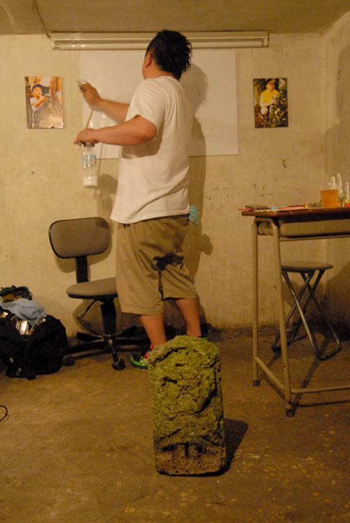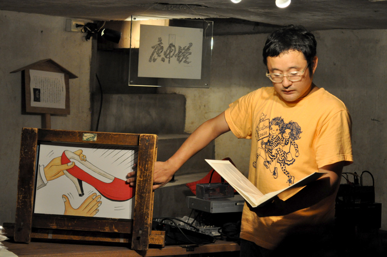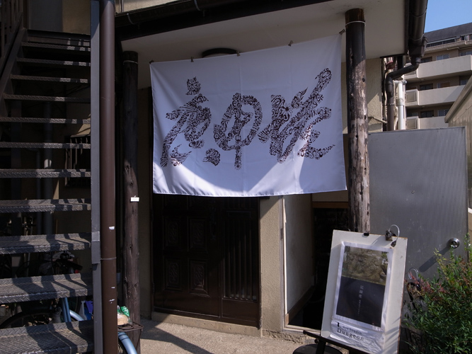 初めて地下室に来る人はたいがい道に迷うのですが、何人かの人がこの幕のおかげで遠目にすぐわかった、と言っておりました。この展覧会のメルクマール的な作品です。