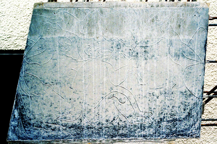 武盾一郎「線譜 庚申塔」実際の庚申塔に刻まれた文字を、写真からトレースしてカリグラフィーを描き、さらにそれをポンジに印刷して幕に仕立てています。下の写真がその原画。