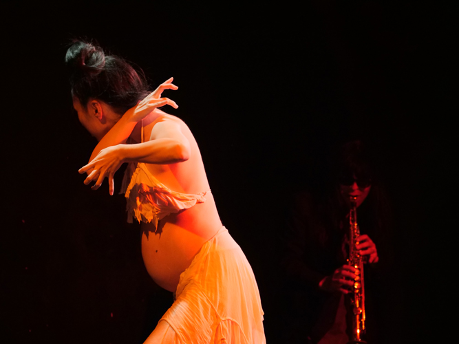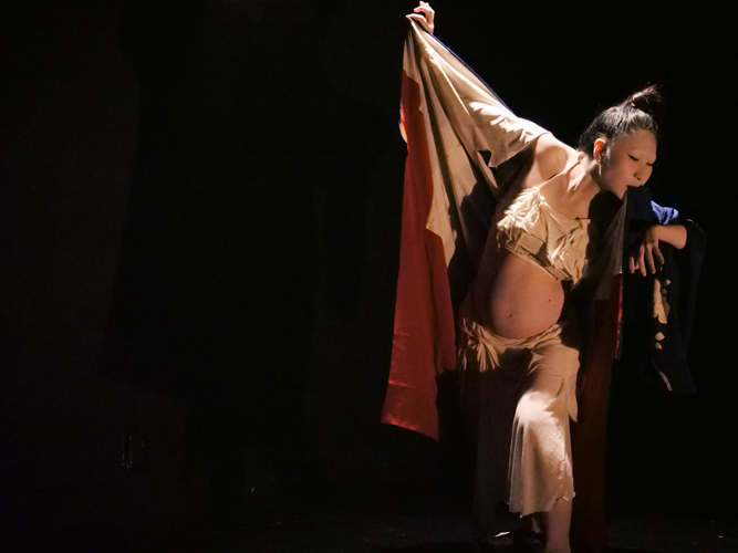 ■実験躰ムダイムダイさんは妊娠8ヶ月の身重の体に妖艶な着物を纏って登場。フルートなどの演奏と絡みながら、ぽってりとふくらんだお腹を晒し、白粉の匂い立つような、なよやかな踊りを披露してくれました。