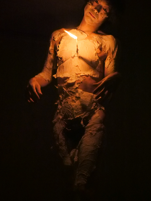 ■成田護フェスティバルの掉尾を飾った成田さんは、世評の高い「死踏」を8年ぶりに再演。蝋燭の灯りだけで踊るこの作品は、地下室だとアニミスティックな雰囲気が増幅され、あたかも洞窟の中でとりおこなわれる始原の儀式を見るようでした。