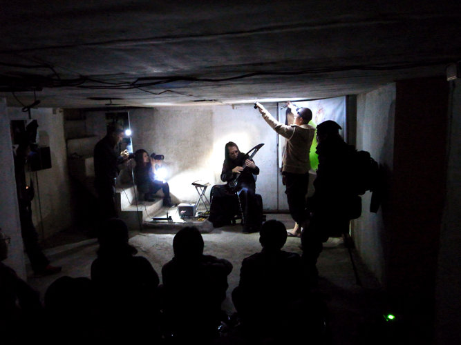 "展覧会場に展示してある写真は、どのようにして撮影されたのか?"を実際に ご来場の皆様に体験していただきます。JINMOによる無伴奏独奏がおこなわれ、4人のShooter(展示作家4名)が執拗にシャッターを押し続けま す。演奏する者と撮影する者、同じエネルギーで表現されていきます。同じエネルギーでもって、目撃せよ!